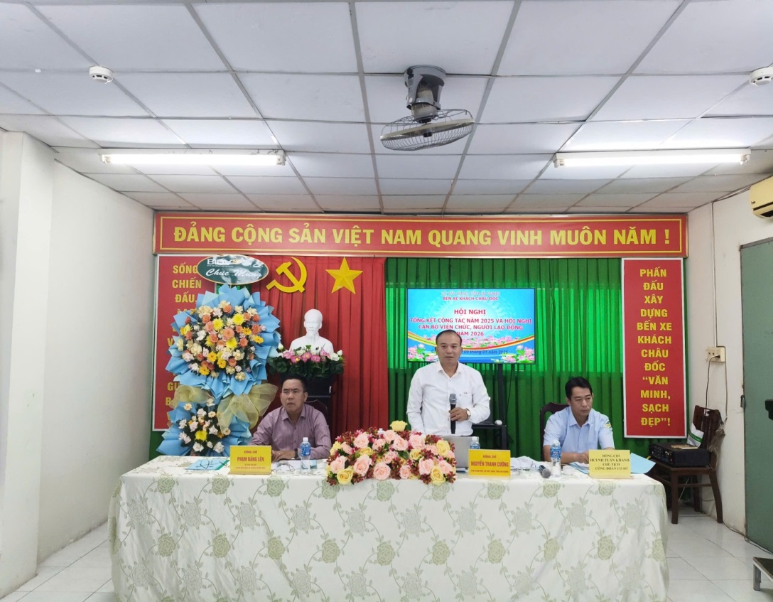 Ngày 09/01/2026, Bến xe khách Châu Đốc tổ chức đã tổ chức Hội nghị tổng kết công tác năm 2025 và Hội nghị cán bộ, viên chức, người lao động năm 2026. Hội nghị diễn ra trong không khí nghiêm túc, dân chủ, thể hiện quyết tâm đổi mới và phát triển bền vững của đơn vị.